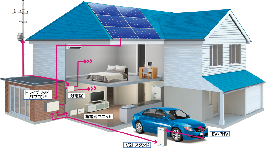 家庭用とEVをつなぐこの仕組みが、まさに“トライブリッド”の核心部分です。
