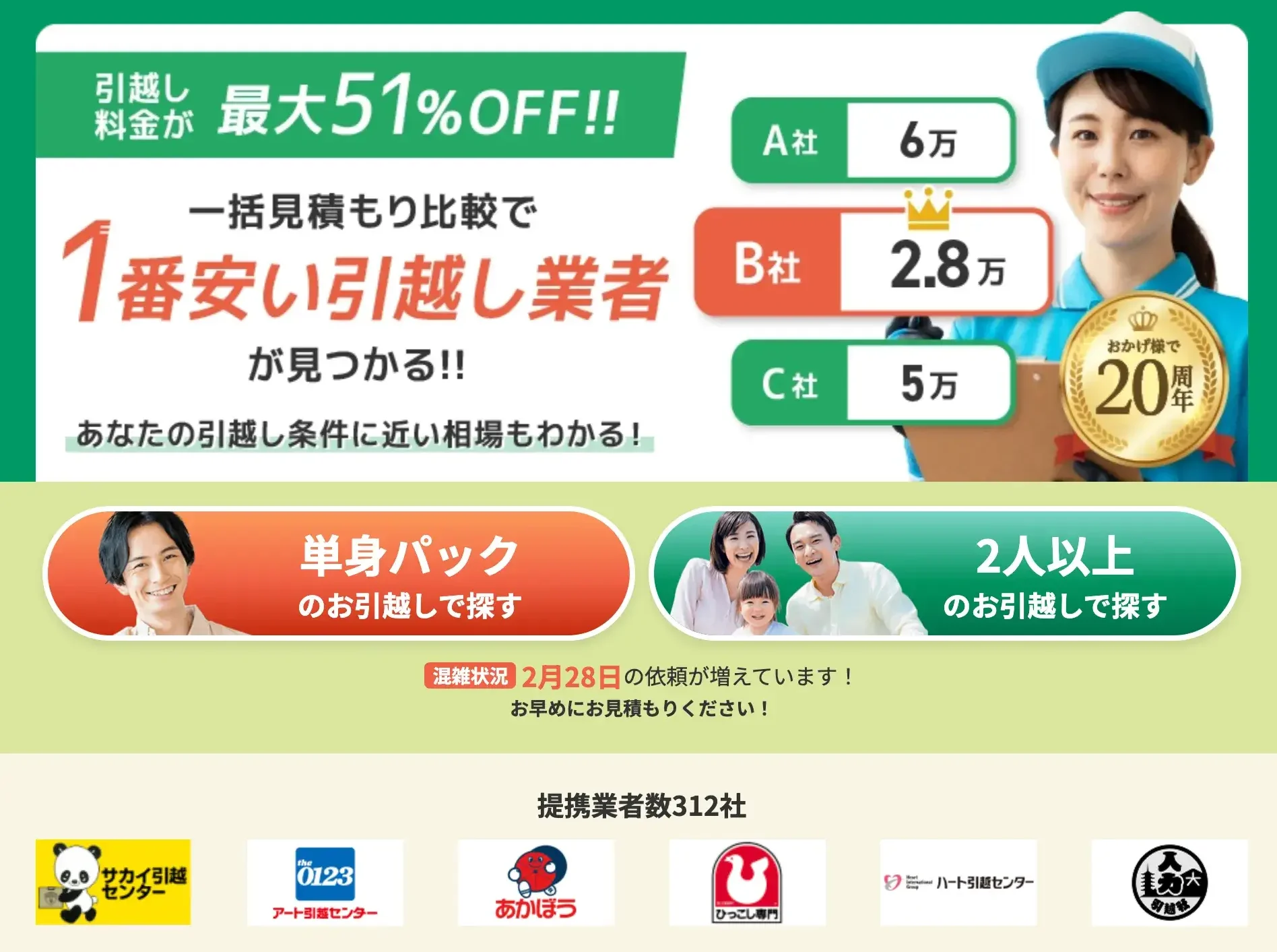 ズバット引越し比較は、サイト運営20年・利用者785万人突破の実績を持つ一括見積もりサービスです。提携業者は312社以上と業界トップクラス。最大12社へまとめて見積もり依頼ができるため、効率よく料金を比較できます。