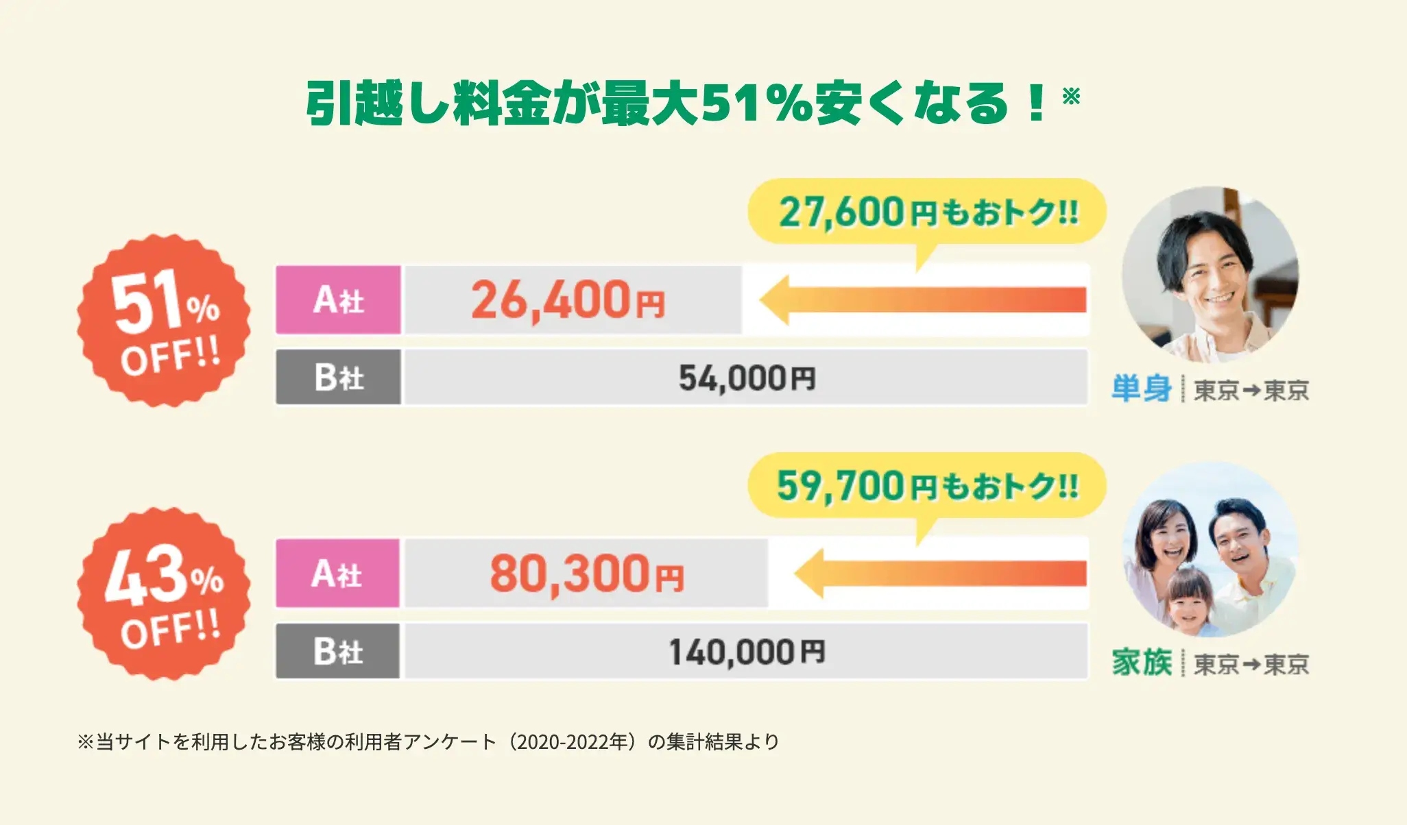 ズバット引越し比較は複数業者が価格競争をするため、引越し料金が最大51%安くなるケースもあります。