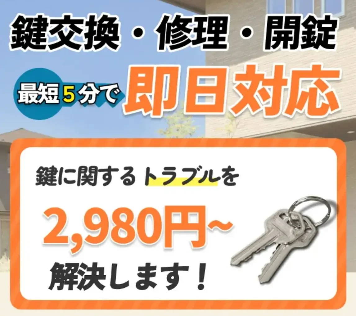街角鍵相談所は、鍵の開錠・修理・交換などのトラブルに対応するサービスで、最短5分で駆けつけるスピード対応が特徴とされています。料金は2,980円〜と比較的リーズナブルで、見積もりは無料となっています。