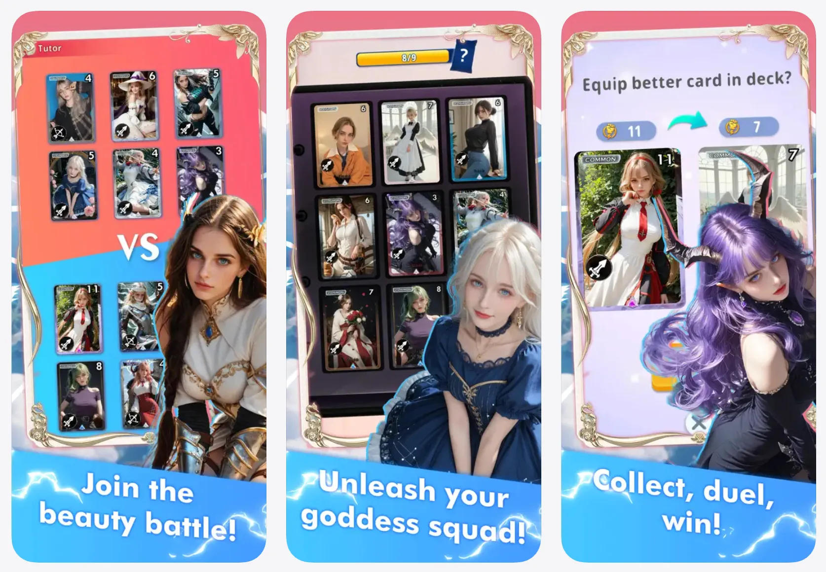今までの、セクシーな女性を起用した似たようなものばかりだったアプリから一新して、カードバトルシステムのこのアプリは、非常に面白いです。まだまだ作り込み要素が沢山あると思います。デッキの数を増やせたり、重複したカードは強化に使えたりコインや、ダイヤに変換できたり、ランク戦以外にも、フリー対戦で手軽にコインを稼げたりなど、勝利すれば自動的にランクが上がっていきパックを引かないと勝てなくなってくる割には報酬が渋いかと。新しいパックが出る度に高くなっていくのに、それまでのパックの入手手段がダイヤでの購入のみにしてしまうのが残念。それまでのパックもコインで引けるようにして欲しいです。あと、同じ会社の他のアプリの方がセクシーな女性ばかりなので、このアプリももっとセクシーな女性にしてほしいです。