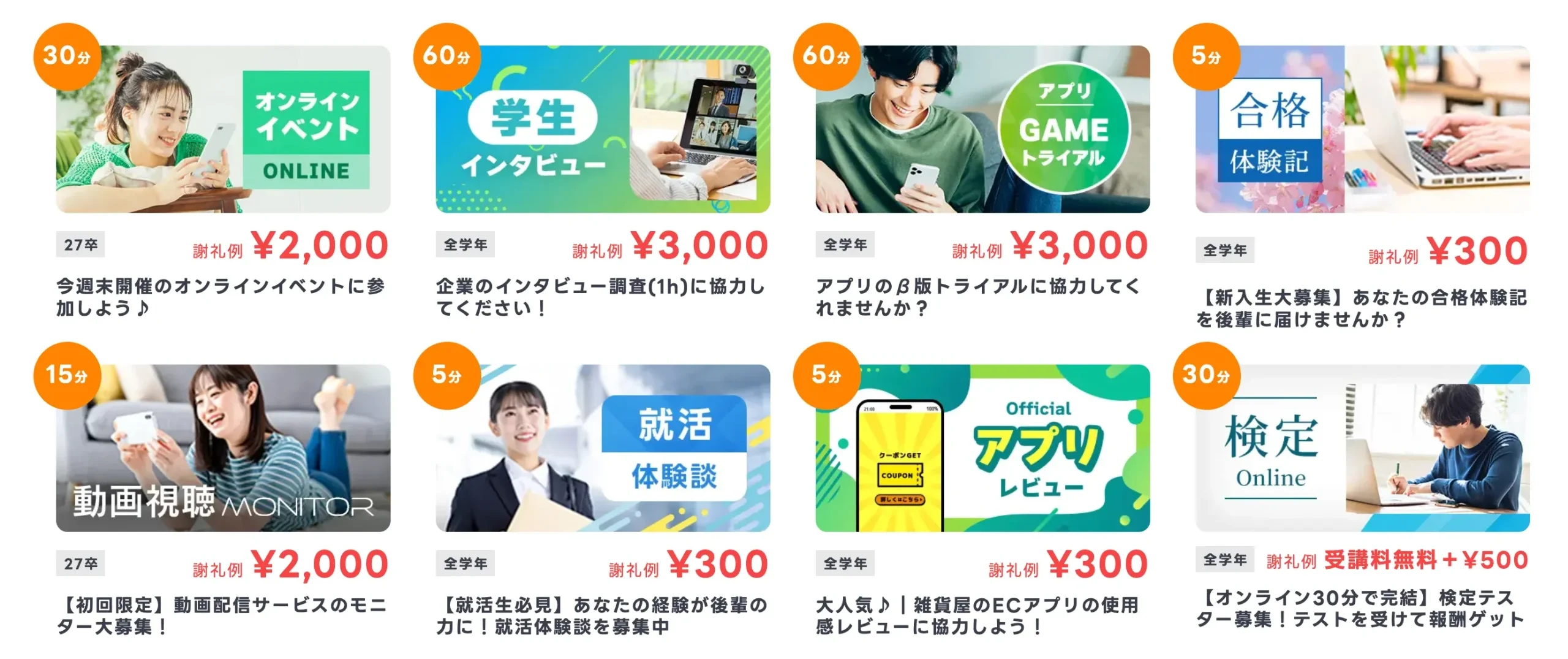 ガクセイ協賛では、短時間で参加できるものからしっかり報酬がもらえる案件まで、幅広い協賛プロジェクトが用意されています。