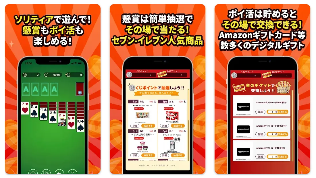 「ポイ活&懸賞ソリティア」は、定番カードゲーム「ソリティア(クロンダイク)」を遊びながら、デジタルマネーやコンビニ商品が当たるポイ活アプリです。