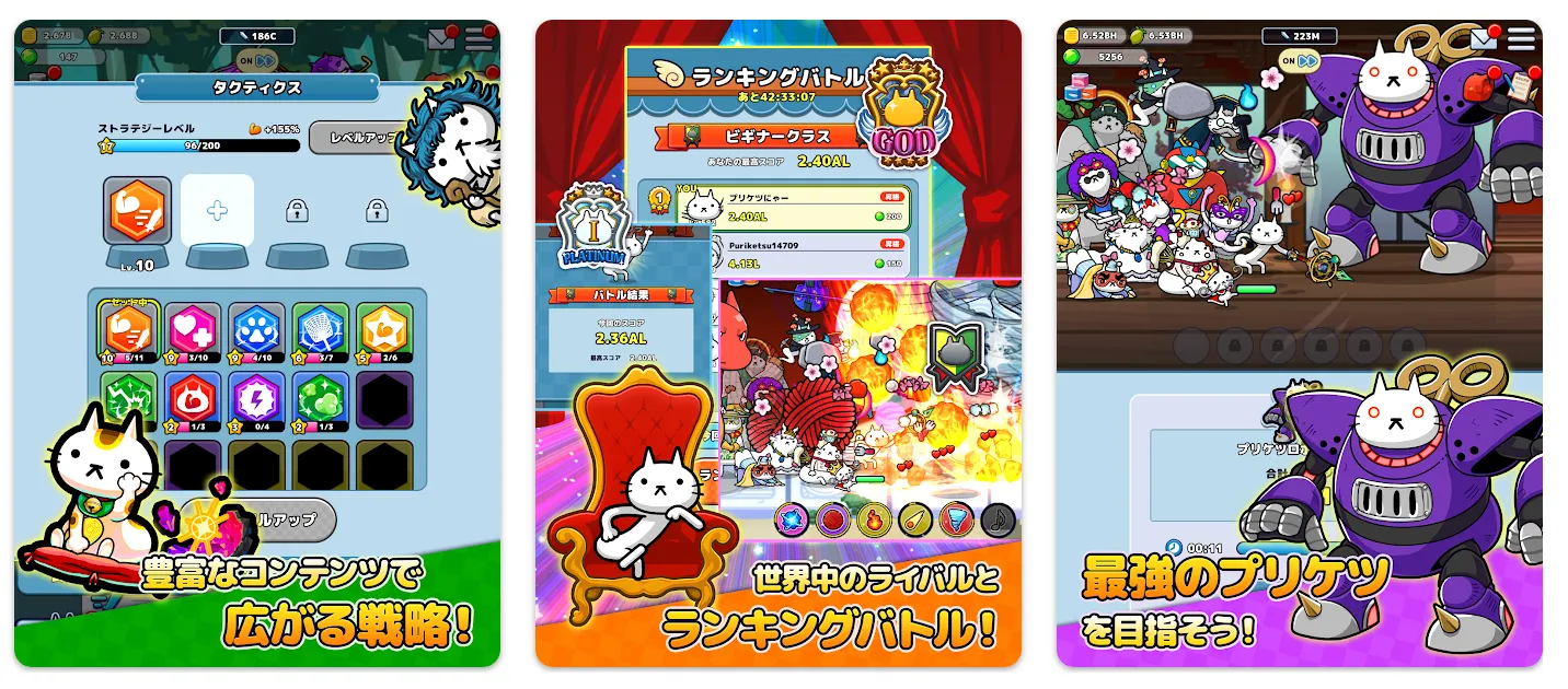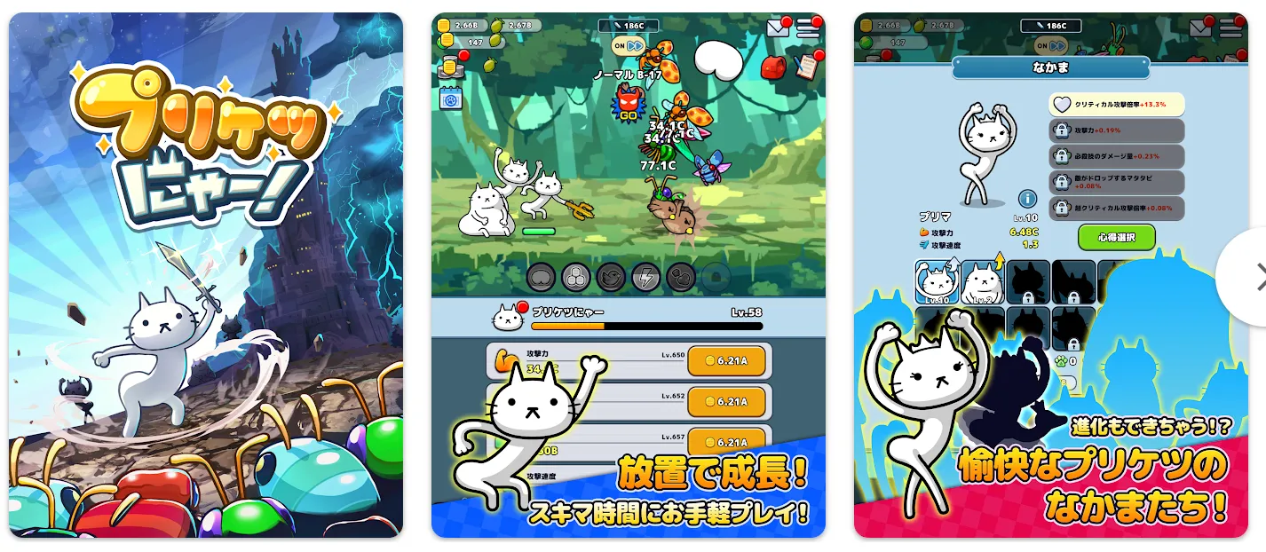 最大の特徴は、操作不要で進行するオートバトル×放置育成。プレイヤーはプリケツの猫たちを強化しながら、世界を救う冒険を楽しめます。