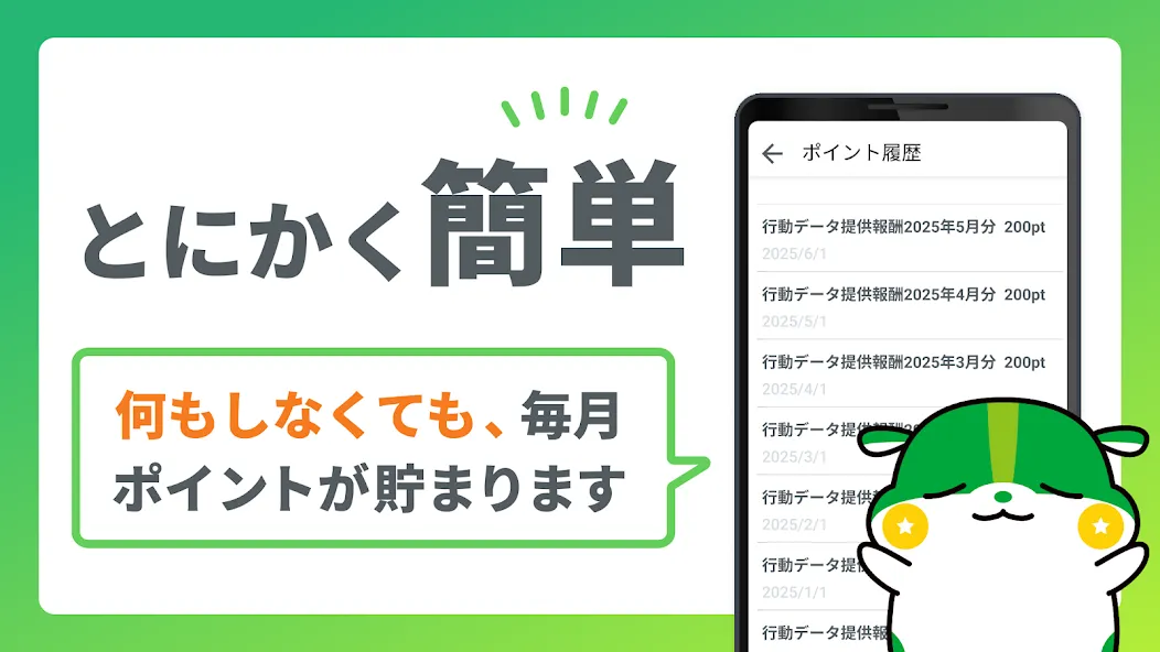 アプリのデザインがシンプルで使いやすい。 また、アンケート回答や広告閲覧は任意なので、負担なくポイ活ができる。 メイン機能である、スマホの情報提供については「アプリにデバイスの閲覧履歴送信・機能の操作を可能にする」を選択する必要あり。 私は運営会社を信頼しているのでアプリを使っていますが、今後、「どんなデータが送信されたかのログ」がアプリ上で閲覧できるようになると嬉しいかも。