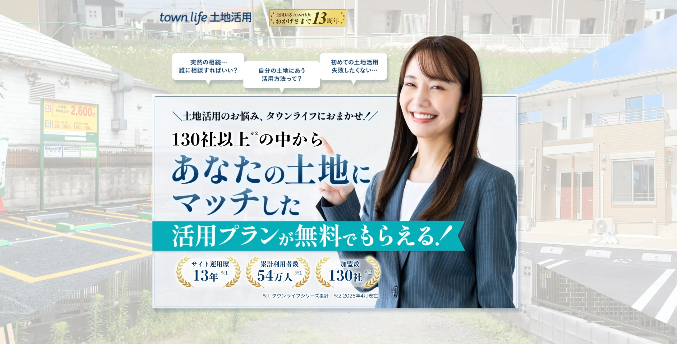 タウンライフ土地活用は、累計利用者数54万人以上・運用歴13年以上・全国130社以上の優良企業が登録している、