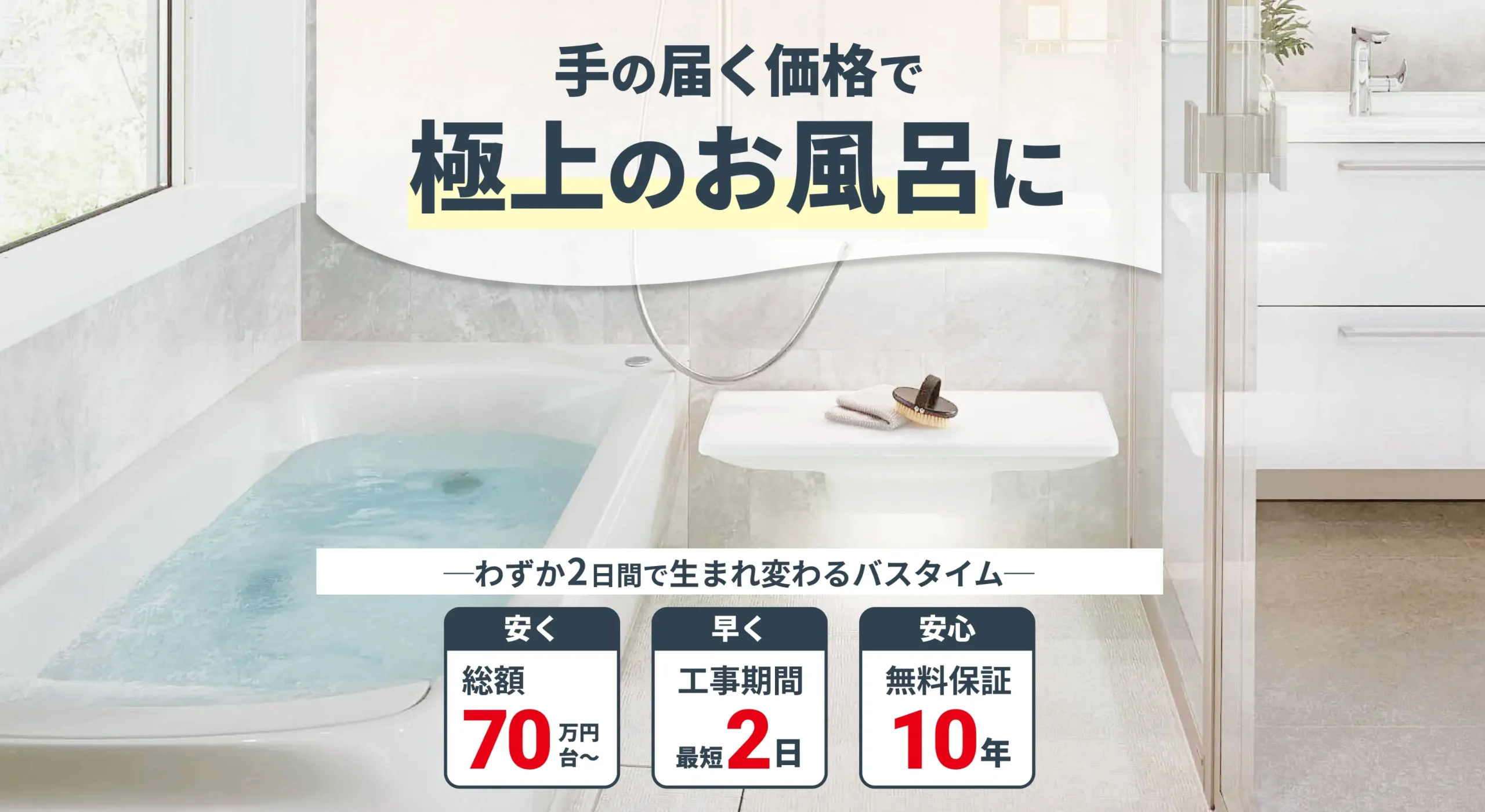 特にお風呂リフォームでは、150万円台からの価格帯・最短2日施工・10年保証といったコストパフォーマンスと安心感を両立しており、初めてリフォームを検討する方でも利用しやすいサービスとなっています。