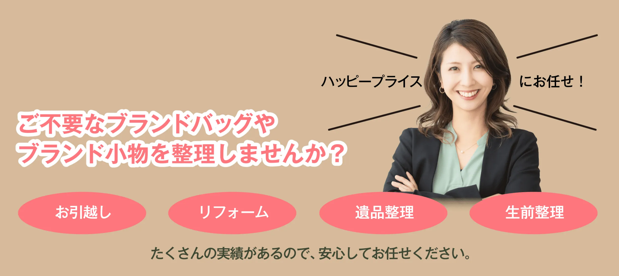 ハッピープライスは、出張買取・宅配買取を全国対応かつ無料で利用できる買取サービスです。広告主の紹介によると、リユース業界で20年の実績があり、累積50万点・1,000億円以上の買取実績、さらに海外販路や業者向けオークションを活かした高価買取に強みがあります。