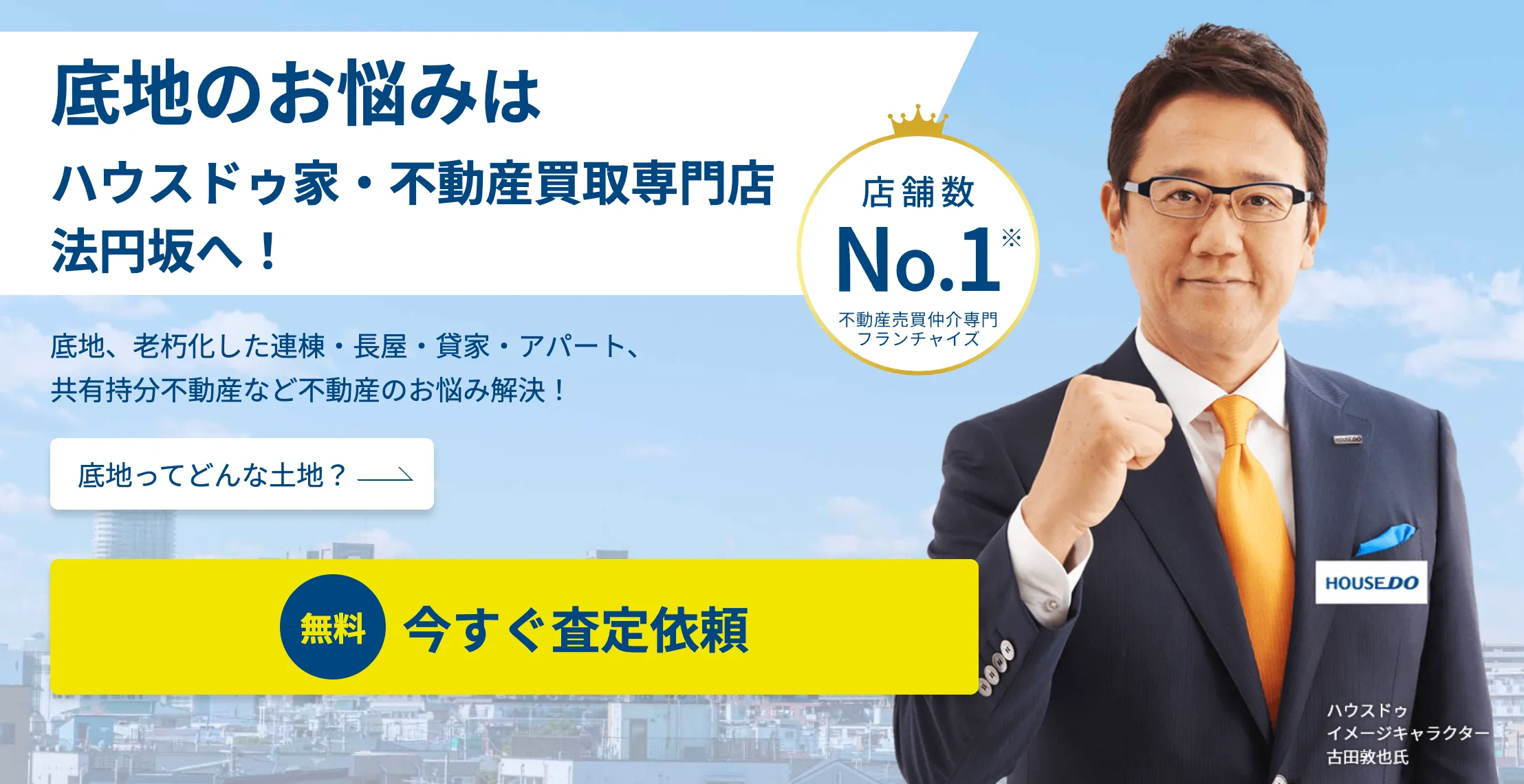 ハウスドゥ家・不動産買取専門店 法円坂は、不動産売買仲介専門フランチャイズ店舗数No.1のネットワークを持つ「ハウスドゥ」の加盟店で、底地や共有持分、老朽化物件など売却が難しい不動産に強い買取サービスです。