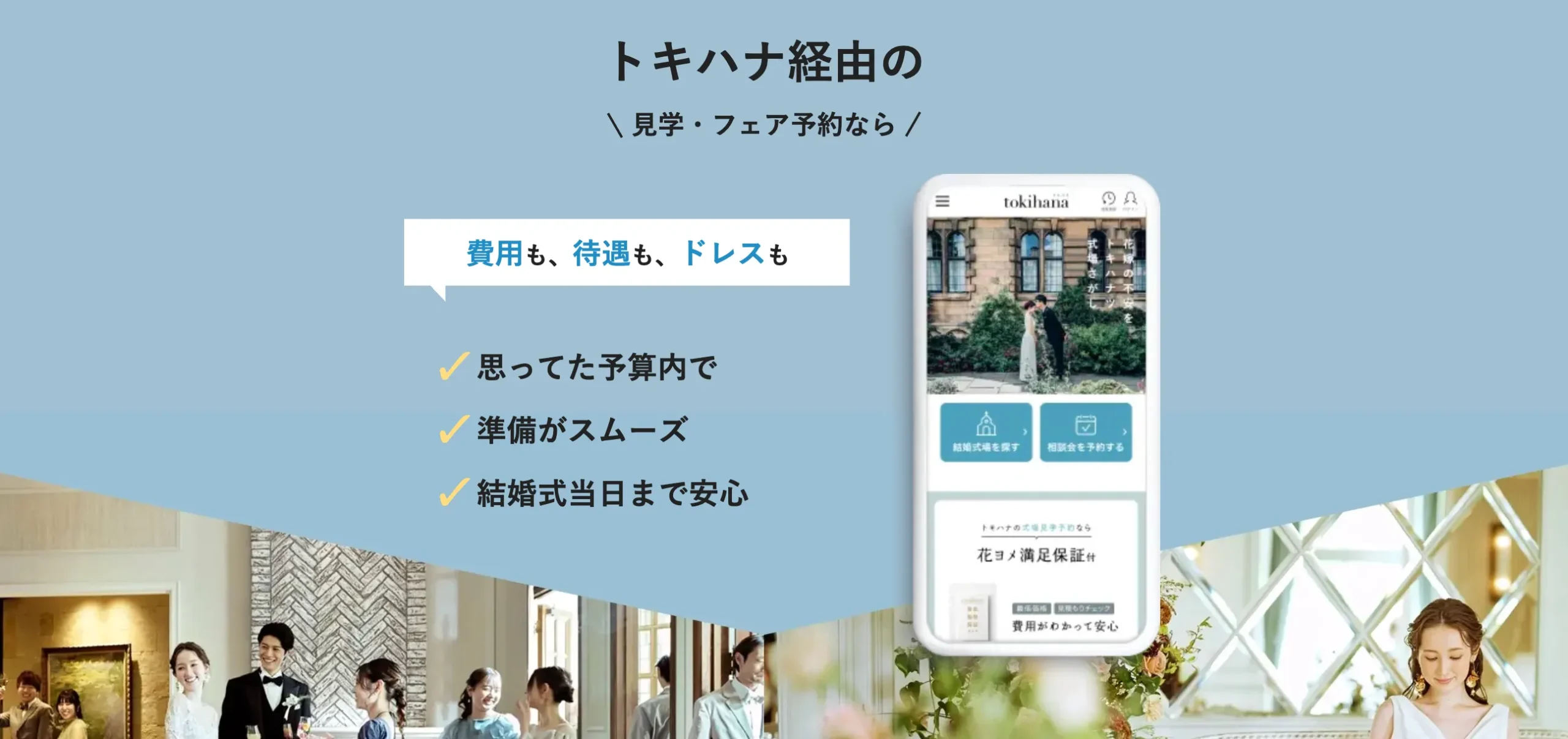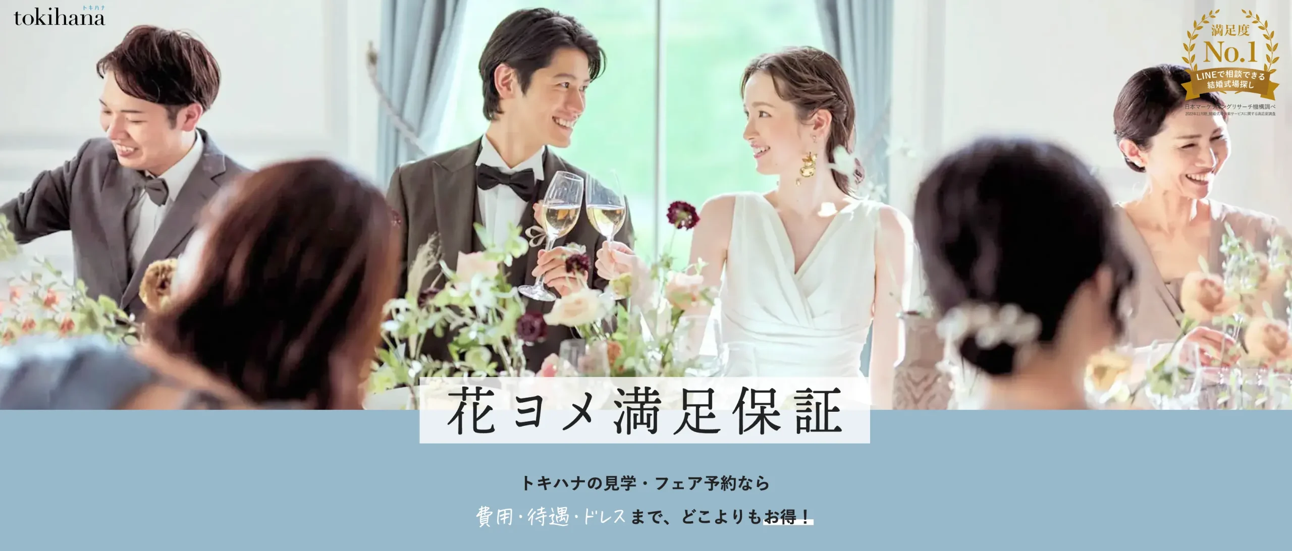 トキハナは、「LINEで相談できる結婚式場探しサービス」満足度No.1を獲得している人気サービスで、元ウエディングプランナーによる無料サポートと、即決不要の最低価格保証が特徴です。