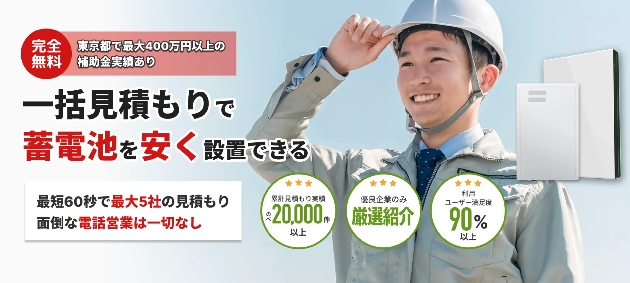 エコ発蓄電池は、家庭用・産業用蓄電池や太陽光発電+蓄電池の一括見積もりが無料でできる比較サービスです。 ただ、蓄電池はまだ価格相場がわかりにくく、設置費用も高額になりやすいため、「エコ発蓄電池は怪しいのでは?」「口コミや評判はどうなの?」と不安に感じる方もいるでしょう。 実際、蓄電池の普及が進む中で、費用や契約に関する相談は増えており、1社だけで即決するのではなく、複数社の見積もりを比較することが重要とされています。 その点、エコ発蓄電池は厳選された施工・販売店の中から1社〜最大5社を無料で比較できるのが ...